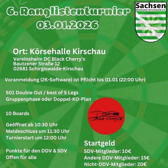 Ewa Karkowska oraz Jan Rosiński wzięli udział #w silnie obsadzonym turnieju darta w Niemczech – 6. Ranglistenturnier Sachsen, który odbył się 3 stycznia 2026 roku w Körsehalle Kirschau w miejscowości Schirgiswalde-Kirschau. Zawody miały charakter rankingowy i przyciągnęły liczne grono zawodników oraz zawodniczek, co przełożyło się na wysoki poziom sportowy i wymagającą rywalizację od pierwszych rzutów.