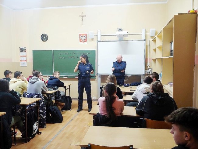 Asp. Zofia Wrzeszcz i st. post Wiesława Ambrozik zajmujące się w nakielskiej komendzie profilaktyką wspólnie z dzielnicowym z mroteckiego komisariatu asp. szt. Piotrem Majewskim odwiedzili wczoraj (23.11.23) uczniów Technikum Mundurowego w Mroczy.