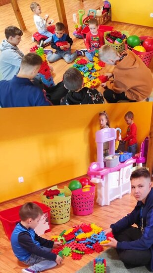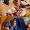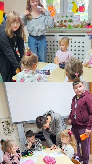 W zadaniach i zabawach pomogli starsi uczniowie z klasy siódmej! Okazali się nie tylko świetnymi pomocnikami przy kartach pracy, ale też mistrzami cierpliwości, kiedy przyszła pora na zabawę