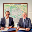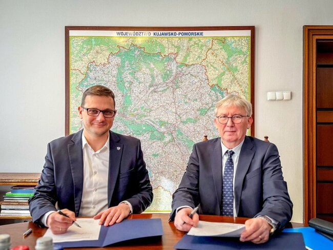 Podczas dzisiejszej konferencji Wojewoda wręczył podpisaną umowę ze Starostą Nakielskim Krzysztofem Błońskim na przebudowę drogi Miastowice-Podobowice.