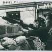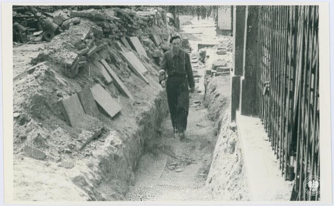 fot. Trzech niezidentyfikowanych powstańców z nieustalonego oddziału AK stoi na jednej z ulic w Śródmieściu Północnym, fot. Henryk Śmigacz, z zasobu Archiwum IPN