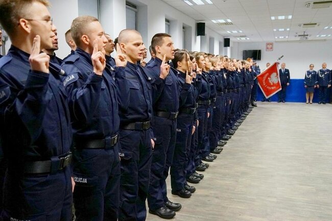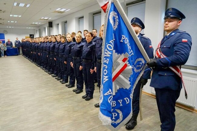 Szeregi kujawsko-pomorskiej Policji zasiliło# 54 nowych funkcjonariuszy. Podczas uroczystej zbiórki nowi policjanci wypowiedzieli słowa roty, zobowiązując się do wiernej służby Narodowi i dbania o bezpieczeństwo obywateli. Słowa przysięgi odebrał Komendant Wojewódzki Policji inspektor Jakub Gorczyński.
