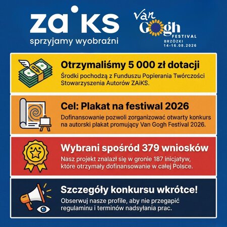 Konkurs na plakat# VAN GOGH FESTIVALU 2026 – z dofinansowaniem ZAiKS. Miło nam poinformować, że Fundacja Twórcze Brzózki otrzymała dotację w wysokości 5 000 zł z Funduszu Popierania Twórczości Stowarzyszenia Autorów ZAiKS na realizację konkursu na plakat VAN GOGH FESTIVALU 2026.