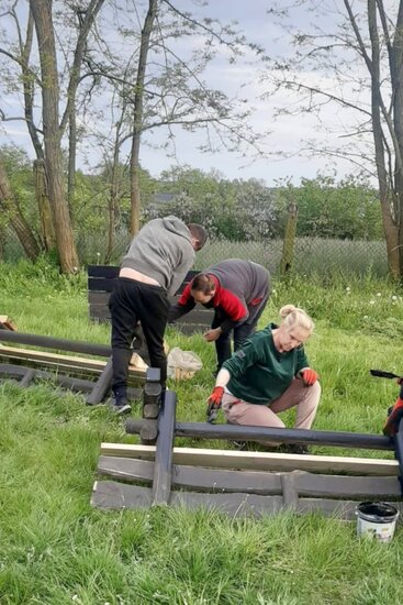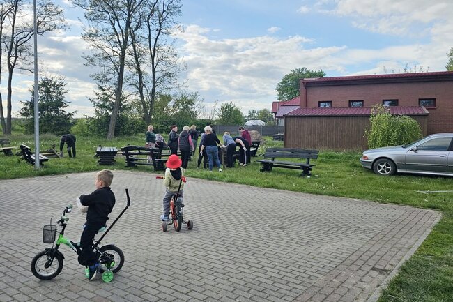 Nasze piknikowe ławki i stoły zyskały nowy wygląd, posłużą kolejne lata naszym mieszkańcom. Jak zawsze przy takich spotkaniach towarzyszą nam dzieci, które też zawsze aktywnie się udzielają.
