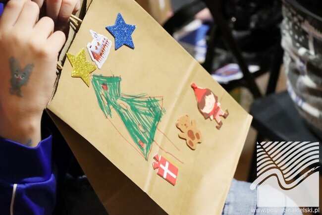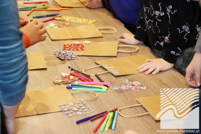 Po prezentacji uczestnicy zostali zaproszeni do warsztatów plastycznych, podczas których mogli stworzyć i ozdobić własne świąteczne torebki. Była to okazja do swobodnej twórczości, zabawy i rozwijania artystycznej wyobraźni.