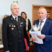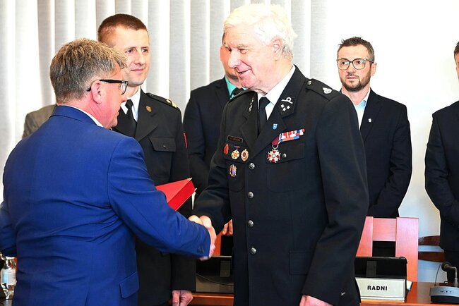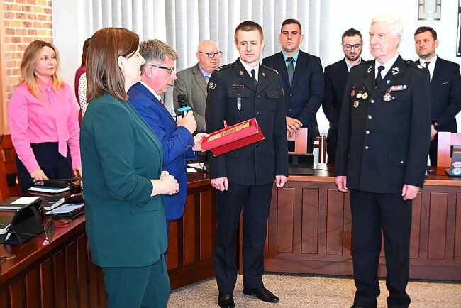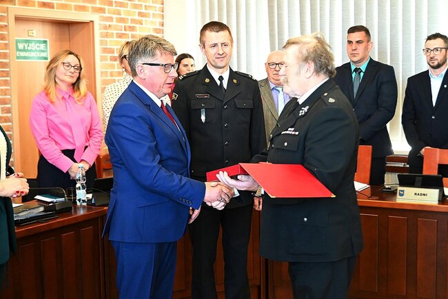 Podczas sesji nie zabrakło również uroczystego akcentu. Władze samorządowe podziękowały za wieloletnią służbę dwóm zasłużonym strażakom ochotnikom.