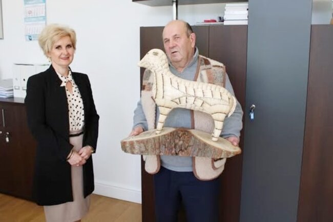 Składamy serdeczne podziękowania # Panu Stanisławowi Gill– pasjonatowi i twórcy wyjątkowych prac z zapałek – za przekazanie na ręce Zastępcy Burmistrza Miasta i Gminy Mrocza, Pani Renaty Jesionowskiej-Zawieja, przepięknego modelu Owieczki Cudki, bohaterki legendy naszego Miasta i Gminy Mrocza.