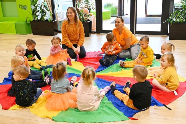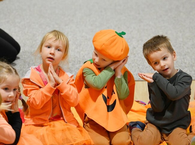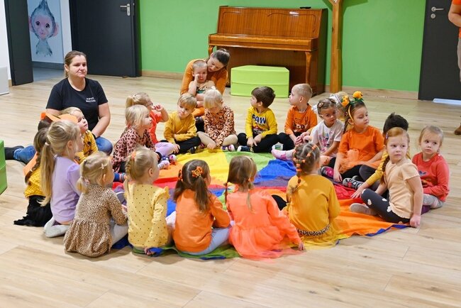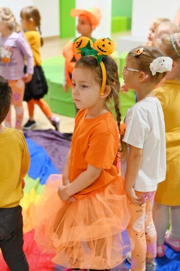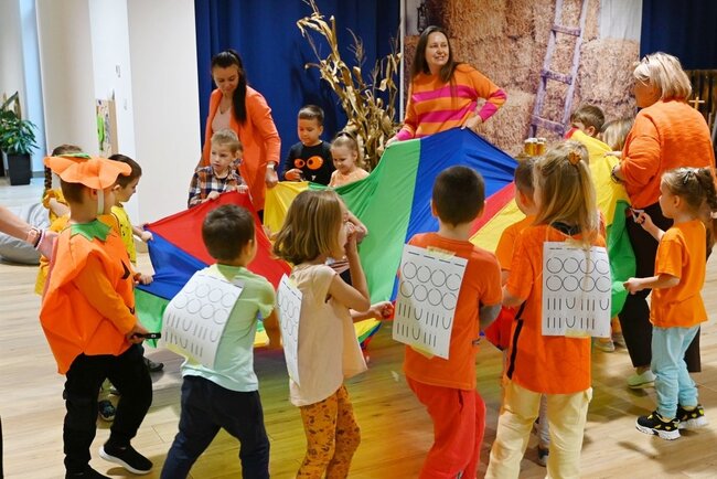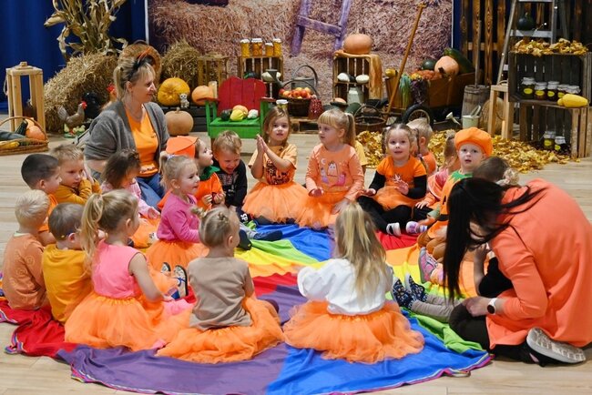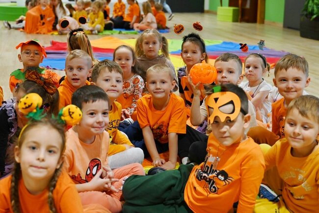 W ramach obchodów Dnia Dyni przedszkolaki przyszły ubrane w odcieniach pomarańczowych, a wszędzie królowały uśmiechy i dobra zabawa. Na dzieci czekało mnóstwo atrakcji – dyniowe konkurencje sportowe, zabawy muzyczno-ruchowe, wspólne tańce, a także małe warsztaty, podczas których powstawały kolorowe prace plastyczne z motywem dyni.