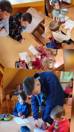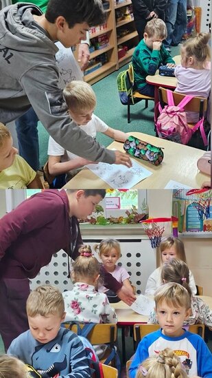 W zadaniach i zabawach pomogli starsi uczniowie z klasy siódmej! Okazali się nie tylko świetnymi pomocnikami przy kartach pracy, ale też mistrzami cierpliwości, kiedy przyszła pora na zabawę