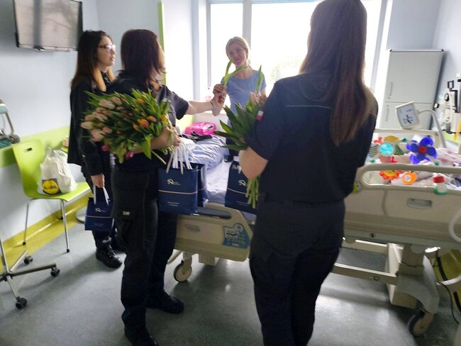 Dziewczynki przebywające na oddziale otrzymały kwiaty i drobne upominki, które na chwilę rozjaśniły szpitalną codzienność. Funkcjonariuszki zadbały jednak nie tylko o najmłodsze pacjentki. Z okazji Dnia Kobiet symboliczne tulipany i życzenia trafiły również do mam czuwających przy dzieciach oraz do personelu medycznego, który każdego dnia z ogromnym zaangażowaniem troszczy się o zdrowie najmłodszych. O drobnym akcencie pamiętano także wobec chłopców przebywających na oddziale – oni również otrzymali słodkie niespodzianki.