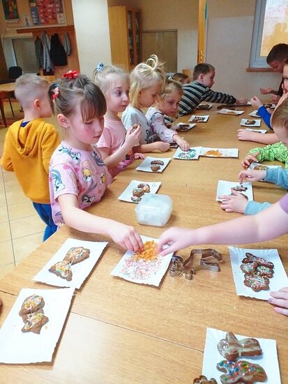 Dzieci poznały tajniki przepisu, miały okazję zapoznać się z niezbędnymi przyprawami i składnikami do ciasta takimi jak goździki, cynamon, miód, cytryna, mąka. Każdy kucharz miał za zadanie wyrobić swoje ciasto, następnie rozwałkować i wykroić dany kształt za pomocą foremki. Zapach pieczonego ciasta rozchodził się po całej szkole. Następnie dzieci za pomocą lukru, czekolady, posypki i skórki pomarańczy ozdabiały ciasteczka. Zadanie sprawiło dzieciom niesamowitą frajdę! Zadanie zrealizowane zostało w ramach innowacji pedagogicznej Sensoryczna podróż po Polsce - Poznaj Polskę wszystkimi zmysłami. Koordynatorzy: Murach Magdalena, Krzyżan Ilona.