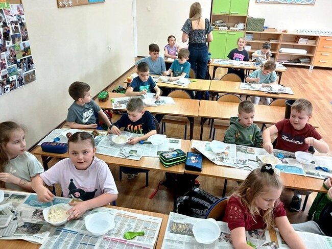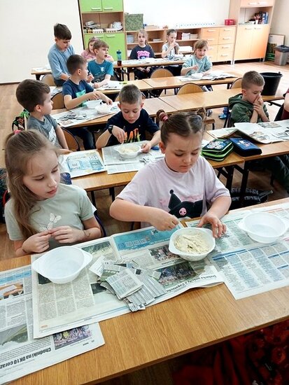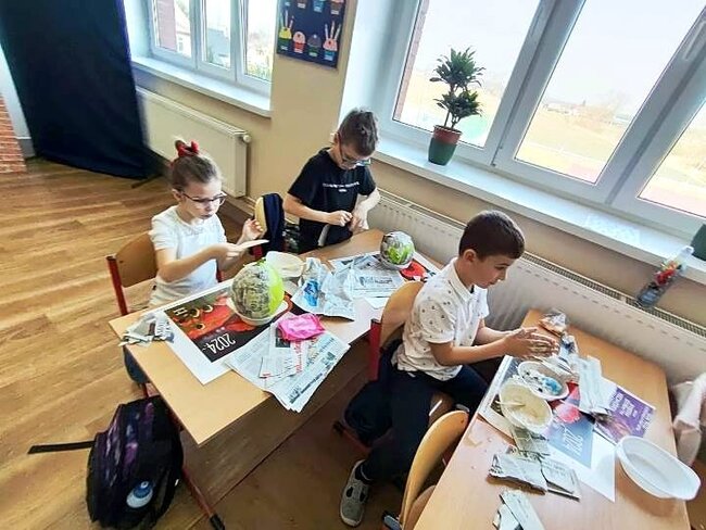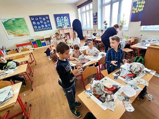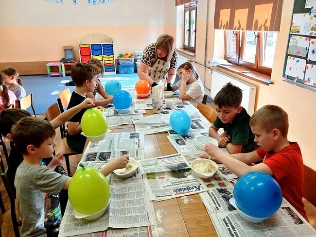 Jednym z punktów przedsięwzięcia są warsztaty plastyczne, podczas których uczniowie wykonują świnkę skarbonkę. Za nami pierwszy etap warsztatów! Podstawowym materiałem do wykonania skarbonki był nadmuchany balon, następnie przygotowanie kleju z mąki i wody oraz skrawki czarno-białych gazet. Dzieci nałożyły dwie warstwy masy papierowej. Podczas kolejnych warsztatów uczestnicy doklejać będą do masy uszy, nos i nogi. Po całkowitym utwardzeniu balon zostanie przebity i wyciągnięty. Etap trzeci to malowanie skarbonek.