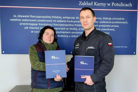 W potulickiej jednostce podpisano porozumienie# o współpracy pomiędzy Zakładem Karnym w Potulicach, a Fundacją Mojra z Kcyni zajmującą się pomocą bezdomnym psom. Dokument podpisali ppłk Krystian Wasiński, dyrektor jednostki oraz Alicja Komorowska, prezes fundacji.