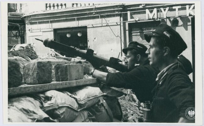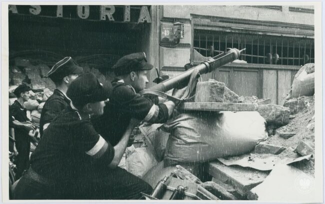 fot. Trzech niezidentyfikowanych powstańców z nieustalonego oddziału AK stoi na jednej z ulic w Śródmieściu Północnym, fot. Henryk Śmigacz, z zasobu Archiwum IPN