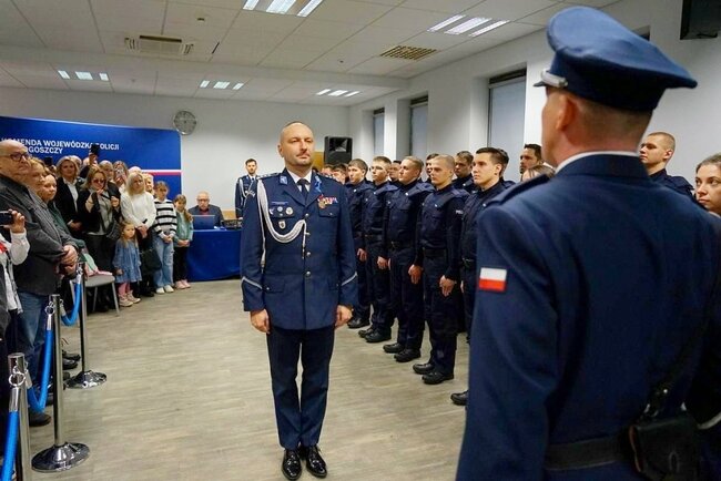 Szeregi kujawsko-pomorskiej Policji zasiliło# 54 nowych funkcjonariuszy. Podczas uroczystej zbiórki nowi policjanci wypowiedzieli słowa roty, zobowiązując się do wiernej służby Narodowi i dbania o bezpieczeństwo obywateli. Słowa przysięgi odebrał Komendant Wojewódzki Policji inspektor Jakub Gorczyński.