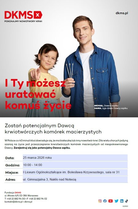 25 marca w I Liceum Ogólnokształcącym# im. Bolesława Krzywoustego w Nakle nad Notecią odbędzie się Dzień Dawcy Szpiku, którego celem jest rejestracja potencjalnych dawców komórek macierzystych. Zachęcamy do włączenia się w akcję wszystkich mieszkańców powiatu nakielskiego.