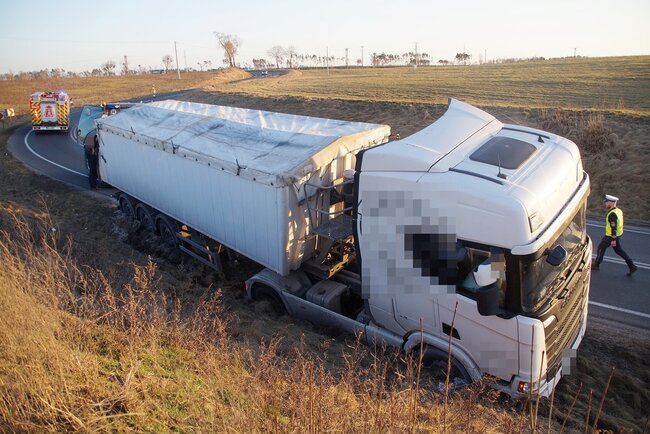Ciężarówka wypadła z drogi. Groźne zdarzenie na zakręcie