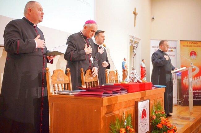 Podczas sprawozdania z okresu presynodalnego wikariusz generalny diecezji bydgoskiej – ks. kanonik Tomasz Cyl – przypomniał, że dokładnie 19 grudnia 2024 roku biskup ordynariusz powołał Komisję Przygotowawczą do I Synodu Diecezji Bydgoskiej. Tworzyło ją 18 osób – 5 świeckich, 2 siostry zakonne i 11 kapłanów diecezjalnych i zakonnych. – Nasze prace rozpoczęliśmy 10 lutego 2025 roku, a później co miesiąc spotykaliśmy się, by przygotować to, co dzisiaj, dzięki woli Bożej i światłu Ducha Świętego, się zaczyna – mówił, dziękując wszystkim zaangażowanym w prace komisji.