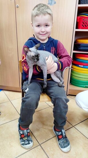 W ramach obchodów Światowego Dnia Kota #odwiedził nasze przedszkole nietypowy gość... Była to mama Klary K., pani Ewa wraz z kotkiem rasy Sfinks o imieniu Czika.