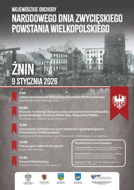 Wojewoda Kujawsko-Pomorski, Marszałek Województwa Kujawsko-Pomorskiego#, Starosta Żniński, Burmistrz Żnina, Towarzystwo Pamięci Powstania Wielkopolskiego 1918-1919 oraz Dyrektor Szkoły Podstawowej nr 1 im. Powstańców Wielkopolskich w Żninie serdecznie zapraszają mieszkańców regionu na Wojewódzkie Obchody Narodowego Dnia Zwycięskiego Powstania Wielkopolskiego, które odbędą się 9 stycznia 2026 roku w Żninie.