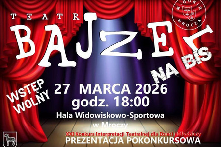 Miłośników teatru zapraszamy# w piątek, 27 marca 2026 r. na godzinę 18:00 do Hali Widowiskowo-Sportowej w Mroczy na wydarzenie „TEATR BAJZEL NA BIS”.