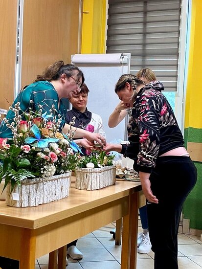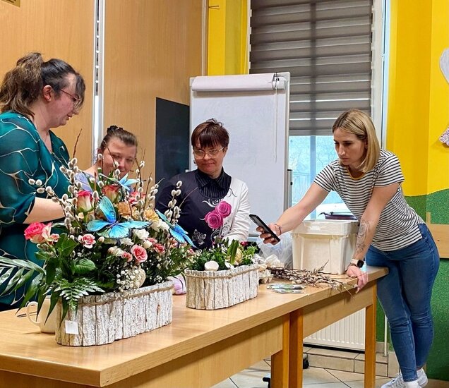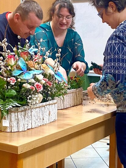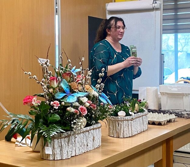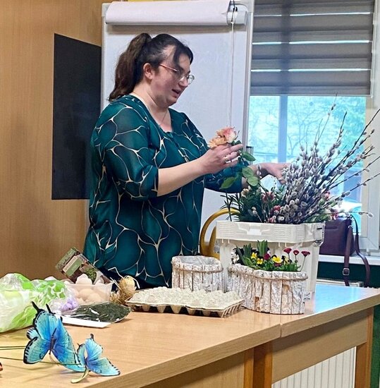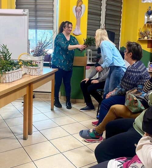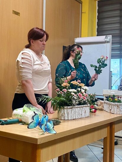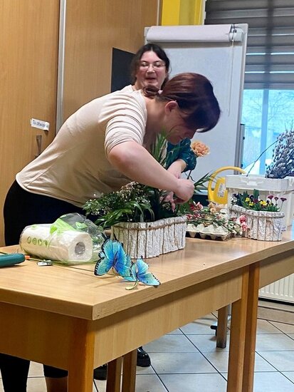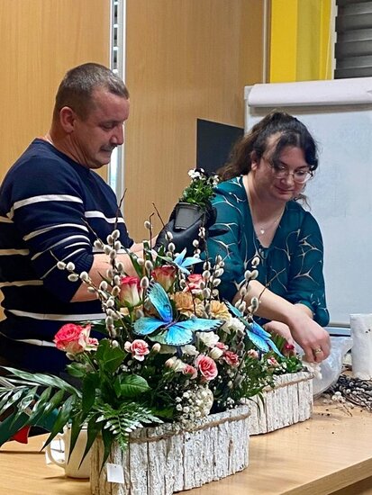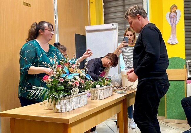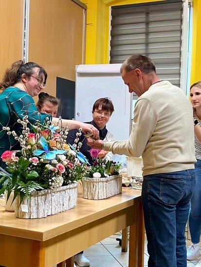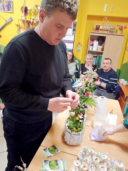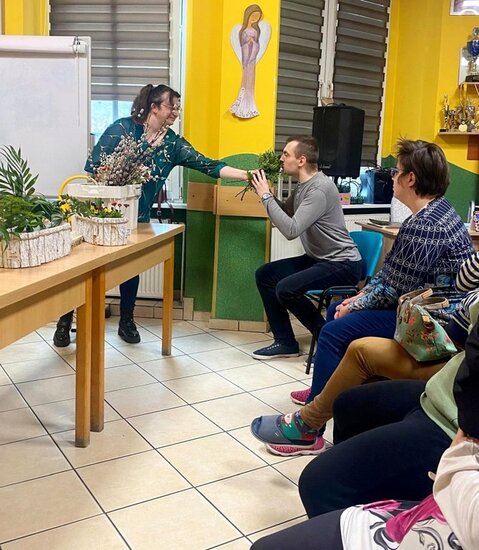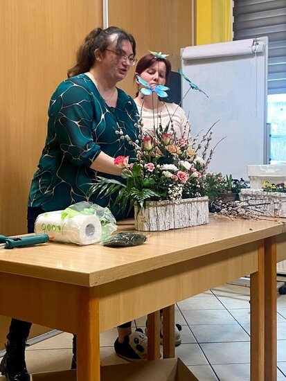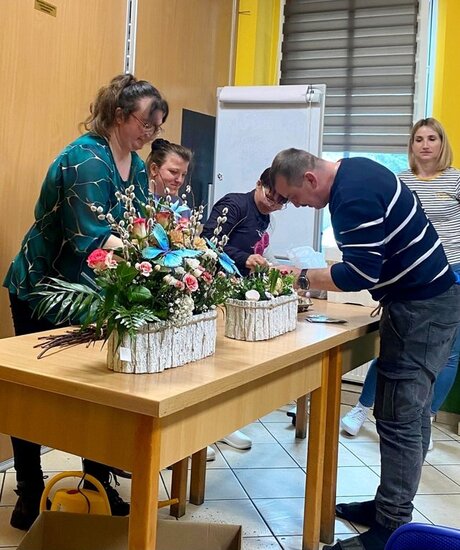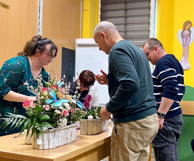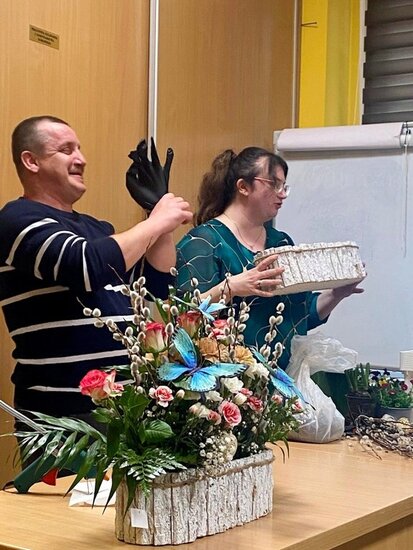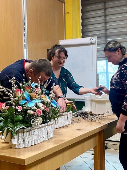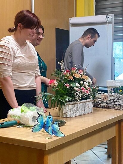 Było to fascynujące wprowadzenie nas do świata florystyki, łączące wiedzę o naturze z zasadami sztuki użytkowej, ponieważ florystyka to nie tylko układania kwiatów w wazonie, to sztuka aranżacji roślin, która uwzględnia ich naturalne piękno, kształt, kolor oraz trwałość. Dzisiaj Pani Magdalena, wspólnie z naszymi uczestnikami tworzyła przepiękne kompozycje z kwiatów oraz zasiali rzeżuszkę na nasz stół wielkanocny. Cała społeczność była pod ogromnym wrażeniem umiejętności Pani florystki. Dziękujemy za twórcze warsztaty, które wzbogaciły umiejętności zawodowe i społeczne naszych uczestników.