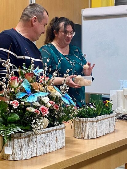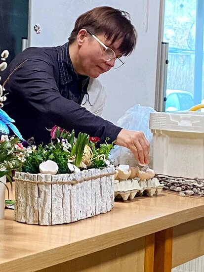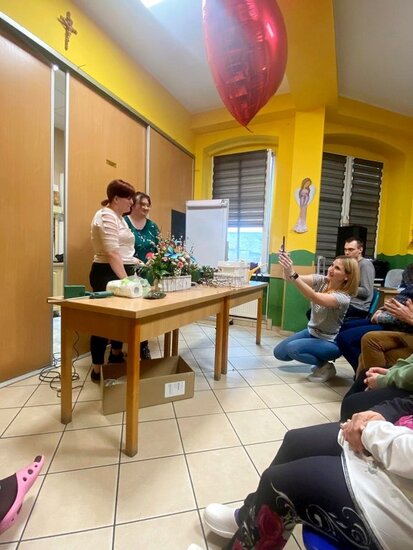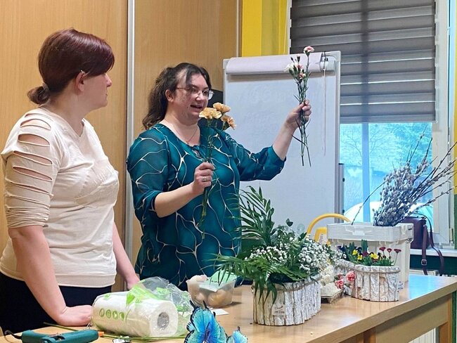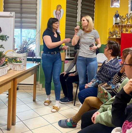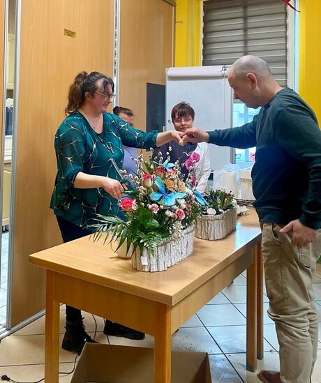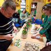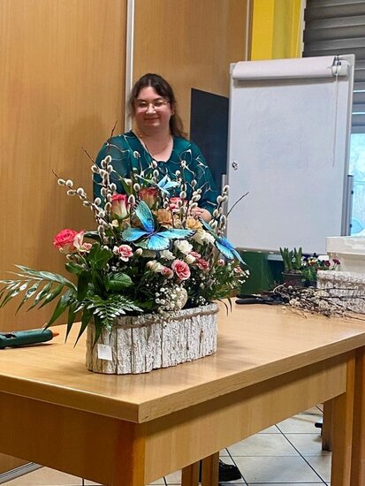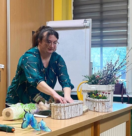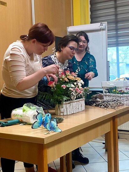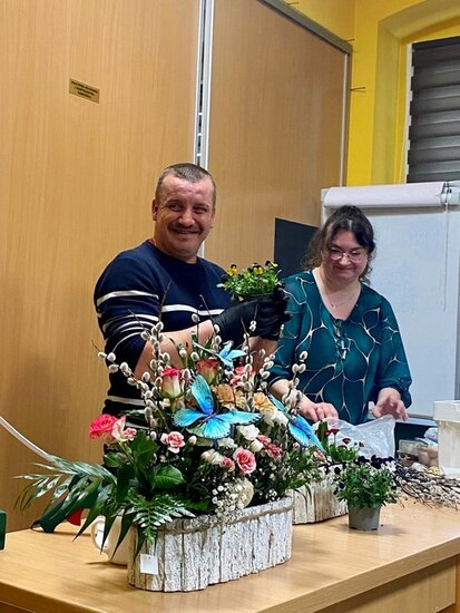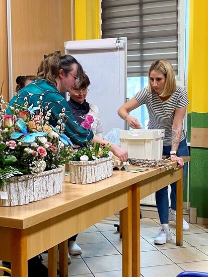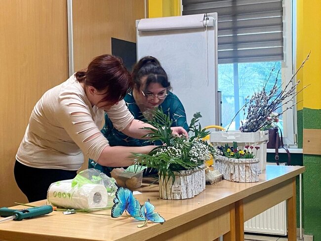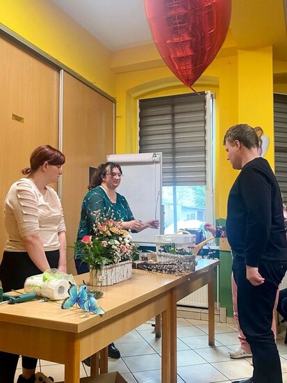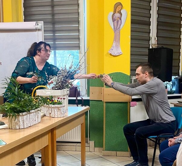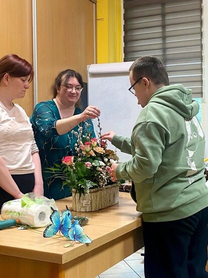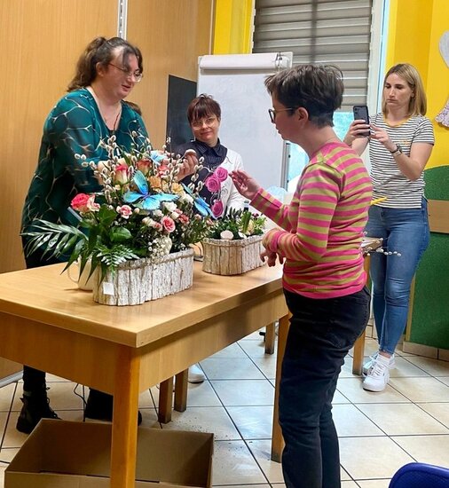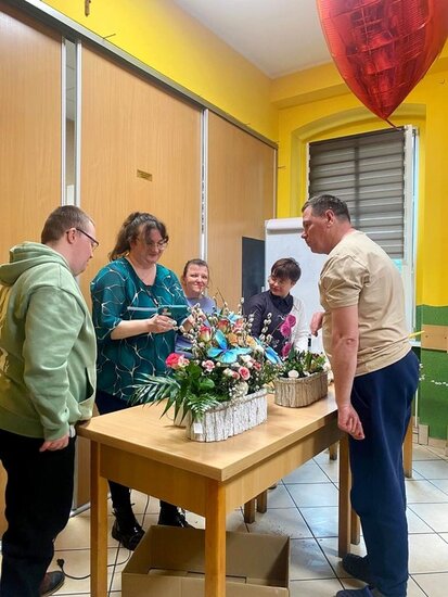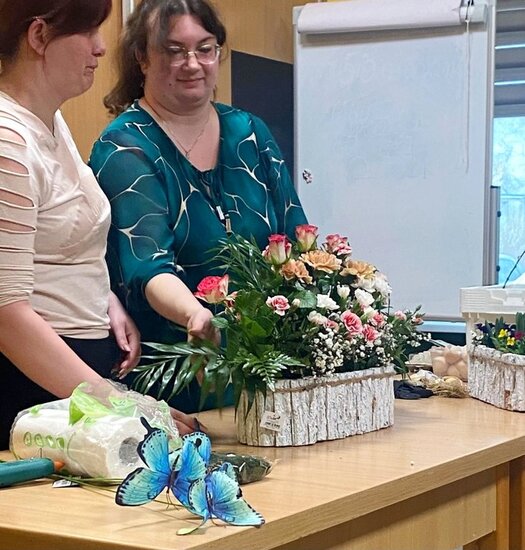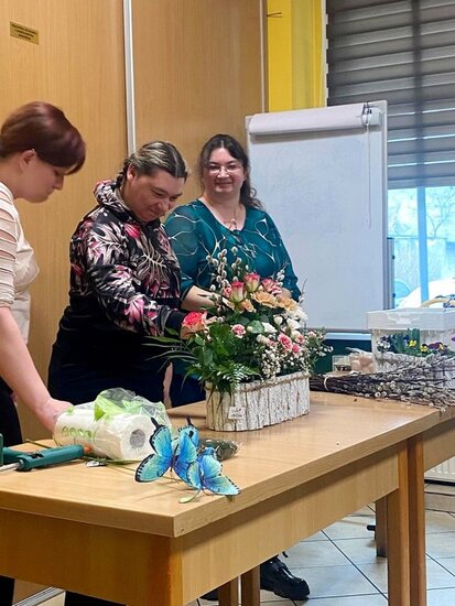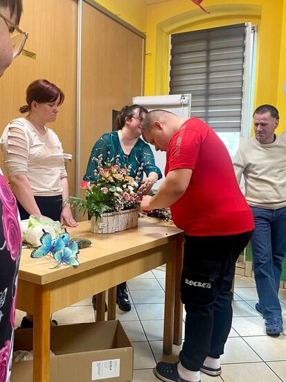 Było to fascynujące wprowadzenie nas do świata florystyki, łączące wiedzę o naturze z zasadami sztuki użytkowej, ponieważ florystyka to nie tylko układania kwiatów w wazonie, to sztuka aranżacji roślin, która uwzględnia ich naturalne piękno, kształt, kolor oraz trwałość. Dzisiaj Pani Magdalena, wspólnie z naszymi uczestnikami tworzyła przepiękne kompozycje z kwiatów oraz zasiali rzeżuszkę na nasz stół wielkanocny. Cała społeczność była pod ogromnym wrażeniem umiejętności Pani florystki. Dziękujemy za twórcze warsztaty, które wzbogaciły umiejętności zawodowe i społeczne naszych uczestników.