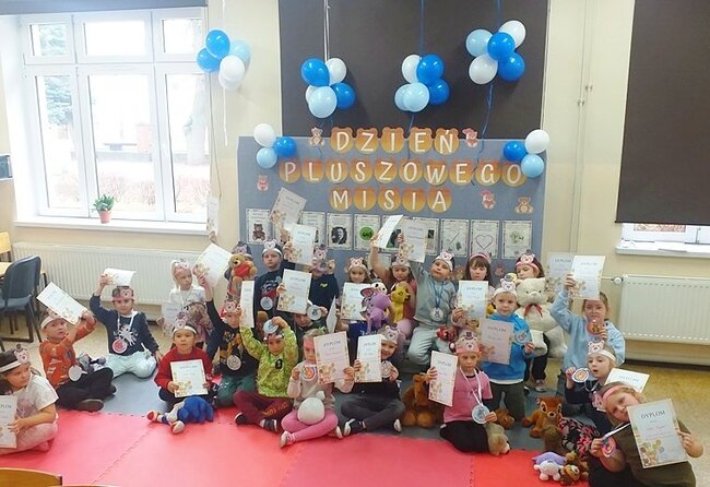 Przedszkolaki świętowały ten dzień wraz ze swoimi pluszakami. Opowiadały, dlaczego lubią swoje maskotki i jak się z nimi bawią. Dzieci poznały również historię powstania Międzynarodowego Dnia Pluszowego Misia, wysłuchały historii książki Wiesława Drabika pt.”Dzień Misia”, bawiły się przy piosenkach, a także uczestniczyły w zabawach ruchowych i zgadywankach, układały misiowe domino, misiowe puzzle. Dzieci wykonały pracę plastyczną jaką był medal. Na koniec zajęć każde dziecko otrzymało dyplom za aktywny udział w zajęciach.