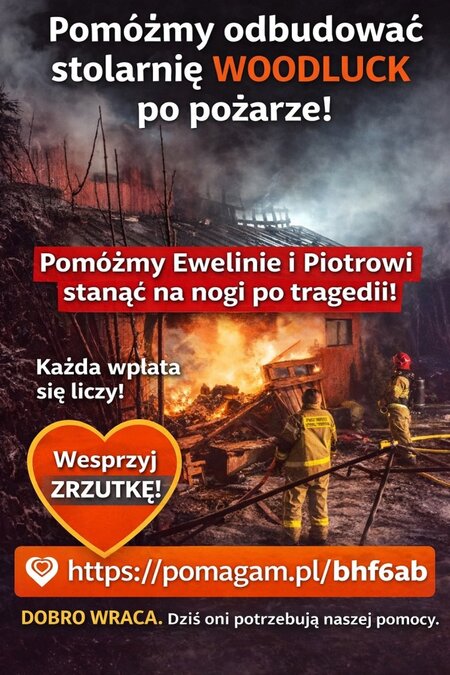 Dlatego pomóżmy im podnieść się z popiołów i odbudować stolarnię WOODLUCK. Każda, nawet mała wpłata to krok w stronę nowego początku, nadziei i powrotu do normalności. Razem możemy sprawić, że to miejsce znów będzie tętnić życiem, a Ewelina i Piotr odzyskają to, co w jednej chwili odebrał im los.